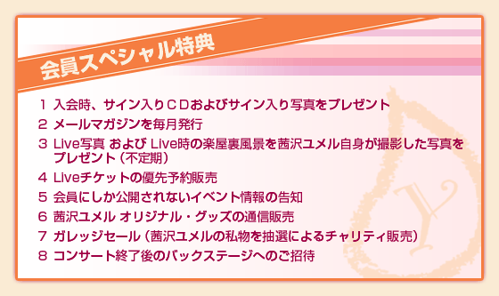 こちらのお申し込みフォームに必要事項を記入の上、お送りください。 自動返信メールにより、口座情報をお知らせいたしますので、ご入金をよろしくお願いいたします。 入金の確認ができ次第、サイン入りCD等々を送らせていただきます。 なお、 入会金は 1,000円、年会費 6,000円となり、継続される方は、次年度から入会金は必要ありません。 さらに大きな力で茜沢ユメルの音楽活動を応援し支えてくださる方は、「ユメル´s スペシャルサポーター」へ是非ご入会ください。月会費1口 3,000円となります。会員特典も充実しています。なお、「ユメル´s パートナー」の会員特典とは区別いたしております。詳細は、お申し込みフォームよりご連絡いただいた後、メールまたは郵送にて送らせていただきます。 ※ 振込み手数料につきましては、ご自身のご負担となりますのでご了承ください。